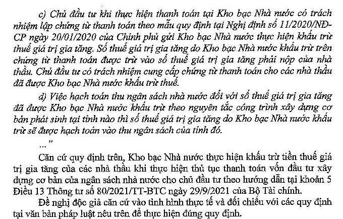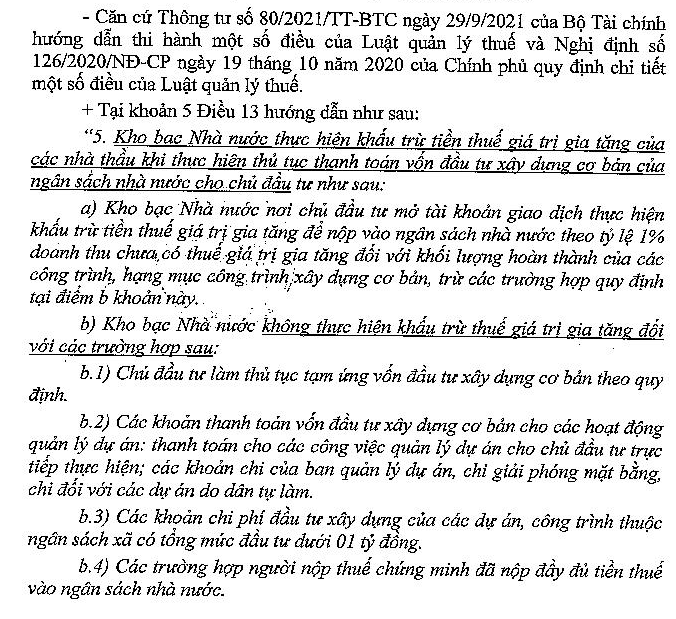 Kính gửi Quý cơ quan Chúng tôi là DN kinh doanh bảo hiểm phi nhân thọ, trụ sở tại Hà Nội có cung cấp gói bảo hiểm công trình cho dự án tại Ba Đình- Hà Nội. Khi thanh toán phí bảo hiểm, KBNN Quận Ba Đình đã dựa vào quy định tại tiết a khoản 5 Điều 13 Thông tư 80/2021/TT-BTC ngày 29/9/2021 để "khấu trừ tiền thuế giá trị gia tăng nộp vào ngân sách nhà nước theo tỷ lệ 1% doanh thu chưa có thuế giá trị gia tăng đối với khối lượng hoàn thành của các công trình, hạng mục công trình xây dựng cơ bản" . Tuy nhiên theo tìm hiểu của chúng tôi thì trong hoạt động xây dựng, thuế suất thuế GTGT 1% này chỉ áp dụng cho đối tượng là "Nhà thầu xây dựng, ký hợp đồng trực tiếp với chủ đầu tư để thi công công trình xây dựng tại tỉnh khác với nơi có trụ sở chính của người nộp thuế"- được quy định ngay trong tiết c khoản 3 Điêu 13 Thông tư 80/2021/TT-BTC, chứ không áp dụng đối với doanh nghiệp bảo hiểm. Vì điểm rõ nét của khoản thuế GTGT 1% này chính là thuế vãng lai ngoại tỉnh( hay thuế GTGT vãng lai ngoại tỉnh) là số thuế VAT mà KBNN cần trích nộp/tạm nộp cho cơ quan thuế (ngân sách tỉnh) tại nơi Doanh nghiệp có hoạt động xây dựng, lắp đặt, bán hàng, giao dịch chuyển nhượng BĐS dù không có đơn vị trực thuộc. Do sắc thuế GTGT có nhiều văn bản ban hành sửa đổi bổ sung nên để có cơ sở trao đổi với KBNN Quận Ba Đình, chúng tôi rất mong nhận được câu trả lời từ Quý cơ quan. Trân trọng cảm ơn!