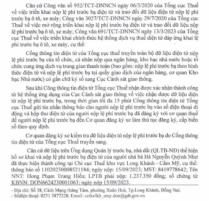 Em có một câu hỏi mong muốn Tổng Cục Thuế giải đáp giúp em ạ. Chồng e tên là Hong Phạm Trung Hiếu, vào ngày 15/9/2023 có nộp thuế mua xe máy qua cổng thông tin thuế điện tử của nhà nước. Hôm nay vợ chồng e đi ra xã để đăng ký giấy tờ xe thì công an bắt buộc phải có giấy tờ hoặc biên lai có mộc đỏ để chứng minh đã đóng thuế và không chấp nhận chứng từ nộp thuế trên app vì họ không biết về việc có app điện tử đóng thuế. Vợ chồng em có chạy ra hai ngân hàng, vừa bên chuyển tiền và bên ngân hàng nhận tiền, cũng ra luôn phòng giao dịch VNPT nơi hỗ trợ cung cấp dịch vụ cho bên thu thuế, và tụi em chỉ nhận lại đúng một câu trả lời là "KHÔNG BIẾT ". Xong tụi em cũng lên tới chi cục thuế Long Khánh và họ nói là tra trên thuế thì đã nộp thành xông rồi, còn chứng từ hay những giấy tờ chứng minh thì họ cũng không biết lấy ở đâu và cũng không có một hướng dẫn nào cụ thể cho tụi em. Vậy em muốn hỏi Tổng Cục Thuế là: 1. App thuế điện tử được lập ra để cho công dân thuận tiện hơn trong việc giao dịch mà tại sao khi đi làm giấy tờ công an lại không công nhận và nói cũng không biết ạ? 2. Những người làm ở chi cục thuế Long Khánh khi tụi em lên hỏi thì chỉ biết nộp thành công, cũng không biết tra cứu những giấy tờ mà công dân đã làm thủ tục lúc nộp, vậy em không biết kỹ năng và chuyên môn của họ trong công việc là như thế nào ạ? Cũng không hướng dẫn giải quyết vấn đề cho công dân. 3. Vậy bây giờ số tiền mà chồng em đã nộp thuế xe máy là: 1.237.350VNĐ đã được nộp vào ngày 15/09/2023 có mã số thuế là: 8419778642 và có chữ ký điện tử bởi Tổng công ty truyền thông vào ngày 15/09/2023, hiện giờ số tiền đó đang ở đâu và đã vô kho bạc của nhà nước chưa ạ? Và giờ tụi em muốn có chứng từ hoặc biên lai chứng nhận đã đóng thuế thì ai sẽ là người giải quyết cho tụi em ạ? E xin cảm ơn và mong sớm nhận được câu trả lời.