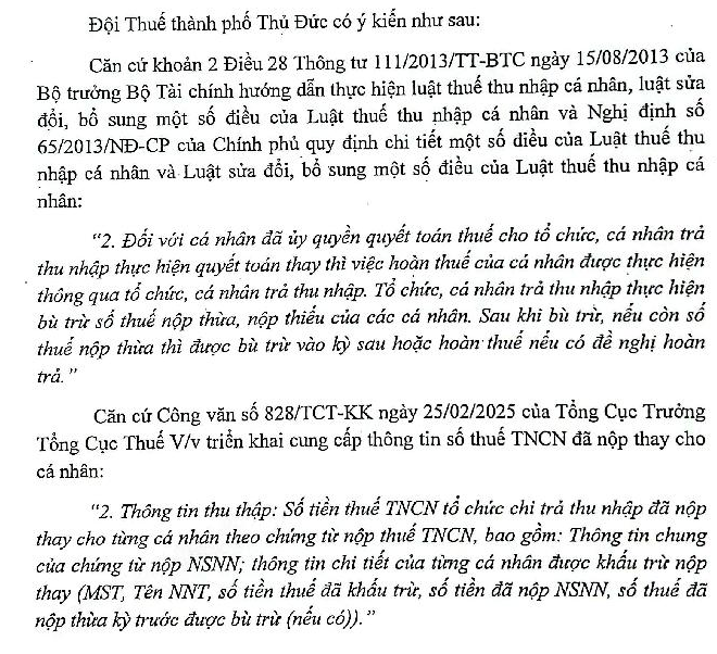 Kính gởi BTC, cho em hỏi nay DN khi nộp Thuế TNCN còn phải nộp thêm bảng kê danh sách chi tiết số tiền nộp Thuế TNCN đã nộp thay Năm 2024 bên em nộp thừa 200 triệu sau khi quyết toán Thuế TNCN. 2025 Bắt phải làm bảng kê danh sách chi tiết 1/ tháng 1+2/2025 bên em chưa khấu trừ, tới tháng 3 có 1 NVien nghỉ việc (2024 có Ủy quyền nộp thay) , thì tiền thuế TNCN dư của họ xử lý như thế nào 2/ Năm 2024 trong số nộp thừa đó có 1 NV (có ủy quyền) - năm 2025 ko có phát sinh, họ muốn hoàn thuế, thì trách nhiệm đó của Doanh nhiệp hay sao, và làm thế nào để họ được hoàn thuế Vì nếu DN tự làm thủ tục hoàn thuế cho NLD và bù trừ hoàn thuế cho kì sau mà dạo này còn phát sinh theo bảng kê, mà bù trừ kiểu đó có còn được không ạ