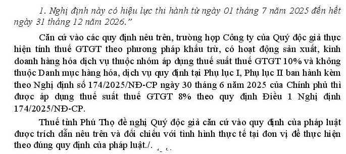 Căn cứ theo nội dung Nghị định số 174/2025/NĐ-CP và đối chiếu với Phụ lục I (Danh mục hàng hóa, dịch vụ không được giảm thuế GTGT) ban hành kèm theo Nghị định, chúng tôi nhận thấy ngành nghề sản xuất kinh doanh của Công ty không nằm trong danh mục loại trừ, do đó có thể thuộc đối tượng áp dụng thuế suất 8% từ ngày 01/7/2025.
