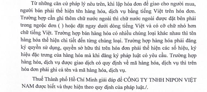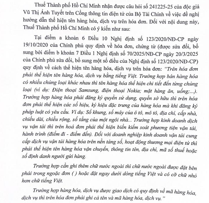 Kính gửi Bộ Tài chính, Công ty chúng tôi hoạt động trong lĩnh vực kinh doanh, nhập khẩu và phân phối thiết bị y tế, chủ yếu nhập khẩu từ Nhật Bản. Khi làm thủ tục nhập khẩu, tên hàng hóa được kê khai theo tên thiết bị y tế đã được công bố, đăng ký lưu hành theo quy định của Bộ Y tế. Tuy nhiên, trong thực tế triển khai hợp đồng với các nhà thầu và bệnh viện, khách hàng thường yêu cầu Công ty xuất hóa đơn theo tên gọi thông thường hoặc tên hàng hóa thể hiện trong hồ sơ chào thầu, hoặc yêu cầu ghi chi tiết hơn để mô tả công năng, cấu hình thiết bị. Một số ví dụ cụ thể như sau: Ví dụ 1: Tên hàng khi nhập khẩu: Máy theo dõi bệnh nhân, Model: SVM-7603 Yêu cầu xuất hóa đơn đầu ra: Máy monitoring theo dõi dấu hiệu sinh tồn (Máy theo dõi bệnh nhân), Model: SVM-7603 Ví dụ 2: Tên hàng khi nhập khẩu: Máy đo chức năng hô hấp, Model: Chestgraph HI-301 Yêu cầu xuất hóa đơn đầu ra: Phế dung kế (Máy đo chức năng hô hấp), Model: Chestgraph HI-301 Ví dụ 3: Hóa đơn đầu vào: Đầu dò, Model: L55 Yêu cầu xuất hóa đơn đầu ra: Đầu dò (Linear cho máy siêu âm Doppler màu 3 đầu dò, model: Arietta V60, serial: 205T5364, hãng Hitachi-Fujifilm), Model: L55 Ví dụ 4: Hóa đơn đầu vào: Đầu dò, Model: UST-5413 Yêu cầu xuất hóa đơn đầu ra: Đầu dò (Linear cho máy siêu âm Doppler màu 3 đầu dò, model: F37, serial: 205Y1642, hãng Hitachi-Fujifilm), Model: UST-5413 Công ty kính đề nghị Quý Cơ quan hướng dẫn việc xuất hóa đơn với tên hàng hóa theo cách gọi thông thường của khách hàng, có bổ sung mô tả trong ngoặc, nhưng vẫn đảm bảo đúng model, chủng loại và bản chất hàng hóa, có phù hợp với quy định về hóa đơn, chứng từ hay không. Mong Quý cơ quan giải đáp, tôi xin chân thành cảm ơn!