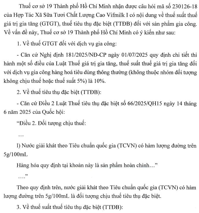 Em chào BTC! Công ty em là đơn vị gia công sản phẩm Nước giải khát theo Tiêu chuẩn quốc gia (TCVN) có hàm lượng đường trên 5g/100ml - thuế GTGT gia công là :10% phải không ạ -“ c) Đối với hàng hóa gia công là giá tính thuế của hàng hóa bán ra của tổ chức, cá nhân giao gia công hoặc giá bán của sản phẩm cùng loại hoặc tương đương tại cùng thời điểm bán hàng;” Đơn vị gia công có phải nộp thuế tiêu thụ đặc biệt không ạ? -Thuế TTĐB : Từ 01/01/2027: 8 %- Từ 01/01/2028: 10% Năm 2026: thuế TTĐB có phải nộp và kê khai không ạ? Em xin cám ơn !