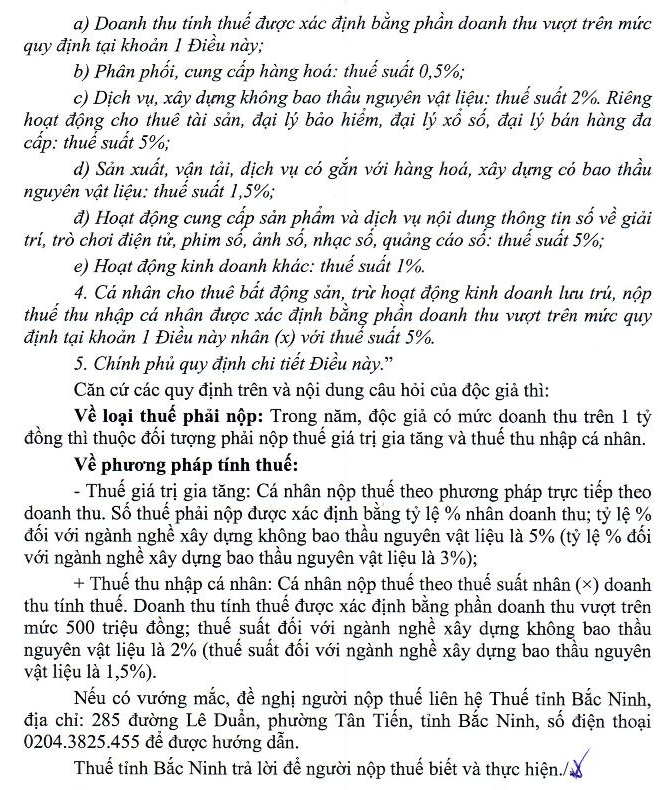 Kính gửi Bộ Tài Chính! Tôi muốn hỏi về những loại thuế mà tôi phải nộp. Tôi là Hùng, làm cai xây dựng, không phải doanh nghiệp, không xuất thuế chỉ nhận công trình từ nhà thầu rồi cho anh em trong đội thợ của tôi làm, thỉnh thoảng tôi có nhận thêm nhà dân để làm (chỉ làm nhân công). Sau mỗi công trình là nhà thầu trả tiền nhân công vào tài khoản của tôi hoặc cũng có thể là 1 -2 năm sau họ mới trả nên tôi tính theo năm thì trung bình mỗi năm tài khoản của tôi nhận tổng khoảng hơn 1 tỷ tiền nhân công từ nhiều nhà thầu trong vùng. Sau đó tôi phát lương cho anh em trong đội. Hiện nay tôi không biết mình phải đóng những loại thuế nào và thuế tính như thế nào? Xin được tư vấn.