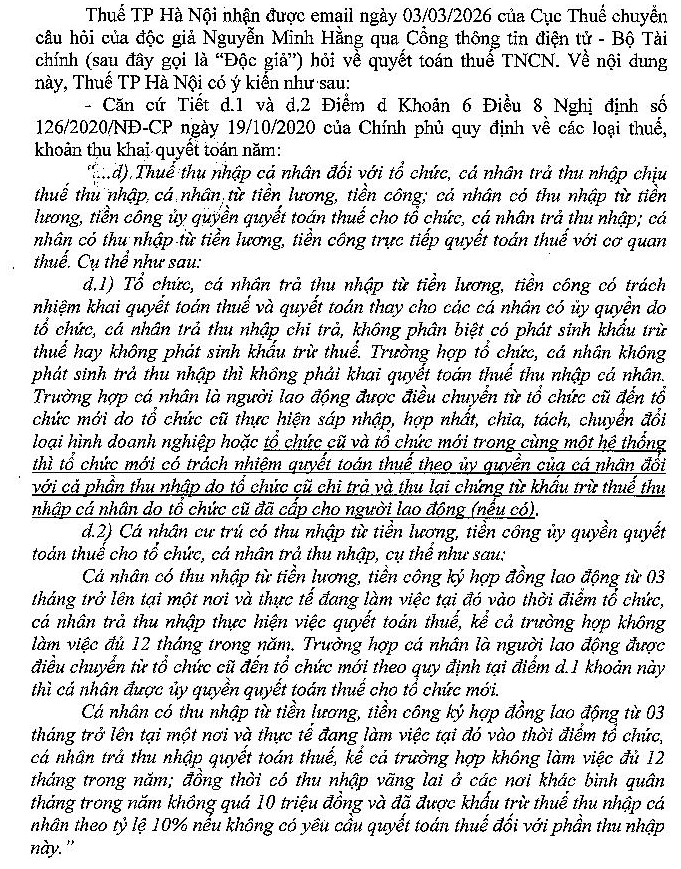 Công ty tôi có cán bộ làm việc tại công ty thành viên (hạch toán phụ thuộc) đến tháng 8/2025. Từ tháng 9/2025, cán bộ được điều chuyển về Tổng công ty. Cá nhân không có thu nhập vãng lai và có ủy quyền cho Tổng công ty quyết toán thuế.