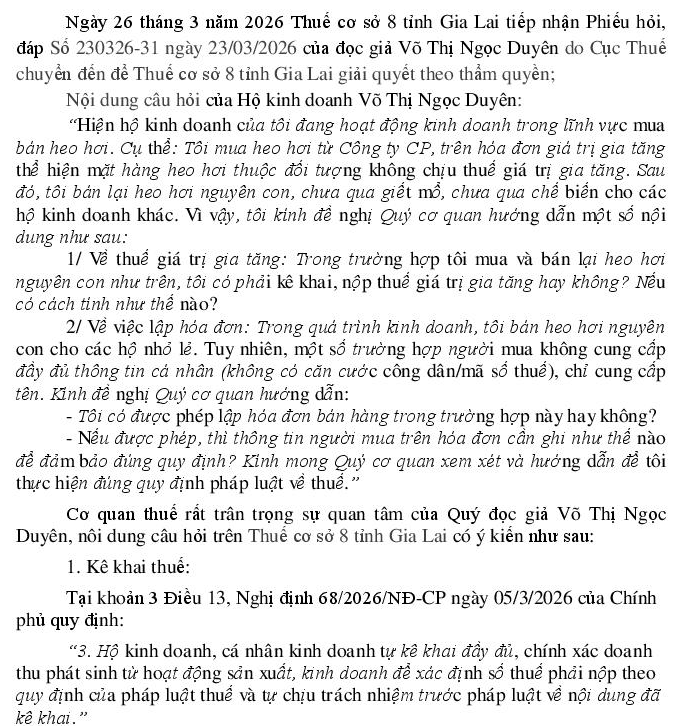 Hiện hộ kinh doanh của tôi đang hoạt động kinh doanh trong lĩnh vực mua bán heo hơi. Cụ thể: • Tôi mua heo hơi từ Công ty CP, trên hóa đơn giá trị gia tăng thể hiện mặt hàng heo hơi thuộc đối tượng không chịu thuế giá trị gia tăng. • Sau đó, tôi bán lại heo hơi nguyên con, chưa qua giết mổ, chưa qua chế biến cho các hộ kinh doanh khác. Vì vậy, tôi kính đề nghị Quý cơ quan hướng dẫn một số nội dung như sau: 1. Về thuế giá trị gia tăng: Trong trường hợp tôi mua và bán lại heo hơi nguyên con như trên, tôi có phải kê khai, nộp thuế giá trị gia tăng hay không? Nếu có cách tính như thế nào? 2.Về việc lập hóa đơn: Trong quá trình kinh doanh, tôi bán heo hơi nguyên con cho các hộ nhỏ lẻ. Tuy nhiên, một số trường hợp người mua không cung cấp đầy đủ thông tin cá nhân (không có căn cước công dân/mã số thuế), chỉ cung cấp tên. Kính đề nghị Quý cơ quan hướng dẫn: • Tôi có được phép lập hóa đơn bán hàng trong trường hợp này hay không? • Nếu được phép, thì thông tin người mua trên hóa đơn cần ghi như thế nào để đảm bảo đúng quy định? Kính mong Quý cơ quan xem xét và hướng dẫn để tôi thực hiện đúng quy định pháp luật về thuế.